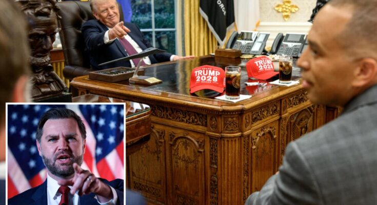 “She kind of runs off and I think to myself immediately, ‘Oh, what the hell have I gotten myself into?’” the vice president said, laughing. “And she comes back with two ‘Trump 2028’ hats to give to Jeffries.”
