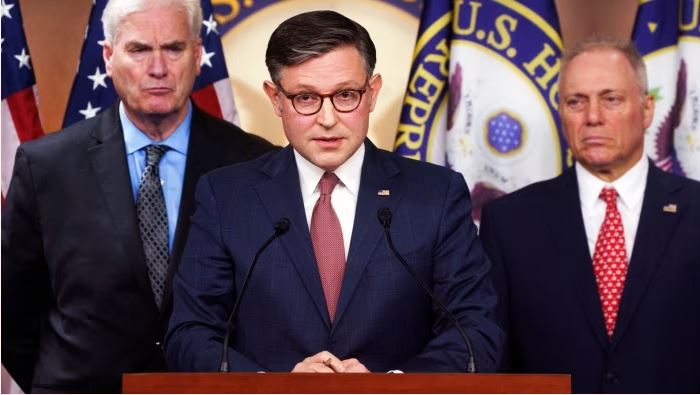 Speaker of the House Mike Johnson (R-LA) (C) speaks to members of the media outside his office at the US Capitol on Wednesday, in Washington, DC.